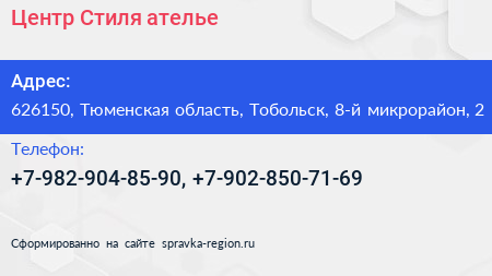 Центр Стиля, ателье по адресу 626150, Тюменская область, Тобольск, 8-й микрорайон, 2 в дальнейшем Организация, размещена в следующих категориях: