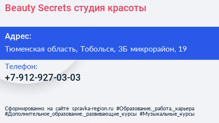 Beauty Secrets, студия красоты по адресу Тюменская область, Тобольск, 3Б микрорайон, 19 в дальнейшем Организация, размещена в следующих категориях: