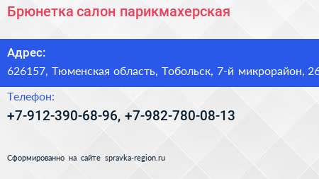 Брюнетка, салон-парикмахерская по адресу 626157, Тюменская область, Тобольск, 7-й микрорайон, 26 в дальнейшем Организация, размещена в следующих категориях: