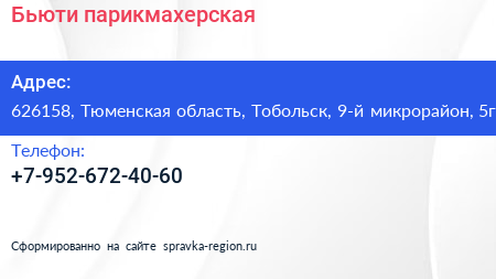 Бьюти, парикмахерская по адресу 626158, Тюменская область, Тобольск, 9-й микрорайон, 5г в дальнейшем Организация, размещена в следующих категориях: