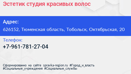 Эстетик, студия красивых волос по адресу 626152, Тюменская область, Тобольск, Октябрьская, 20 в дальнейшем Организация, размещена в следующих категориях: