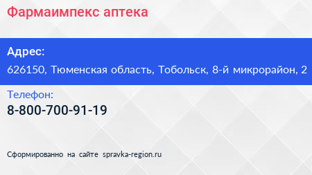 Фармаимпекс, аптека по адресу 626150, Тюменская область, Тобольск, 8-й микрорайон, 2 в дальнейшем Организация, размещена в следующих категориях: