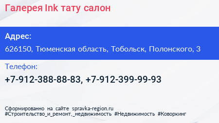 Галерея Ink, тату-салон по адресу 626150, Тюменская область, Тобольск, Полонского, 3 в дальнейшем Организация, размещена в следующих категориях: