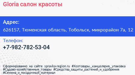 Gloria, салон красоты по адресу 626157, Тюменская область, Тобольск, микрорайон 7а, 12 в дальнейшем Организация, размещена в следующих категориях: