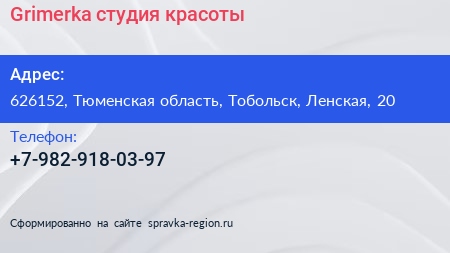 Grimerka, студия красоты по адресу 626152, Тюменская область, Тобольск, Ленская, 20 в дальнейшем Организация, размещена в следующих категориях: