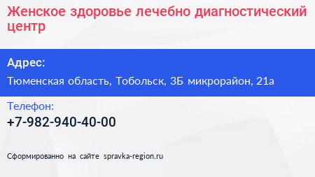 Женское здоровье, лечебно-диагностический центр по адресу Тюменская область, Тобольск, 3Б микрорайон, 21а в дальнейшем Организация, размещена в следующих категориях: