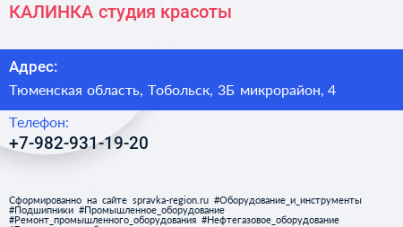 КАЛИНКА, студия красоты по адресу Тюменская область, Тобольск, 3Б микрорайон, 4 в дальнейшем Организация, размещена в следующих категориях: