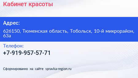 Кабинет красоты по адресу 626150, Тюменская область, Тобольск, 10-й микрорайон, 63а в дальнейшем Организация, размещена в следующих категориях: