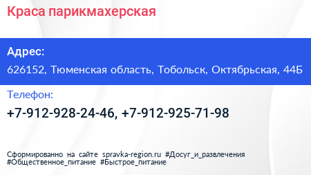 Краса, парикмахерская по адресу 626152, Тюменская область, Тобольск, Октябрьская, 44Б в дальнейшем Организация, размещена в следующих категориях: