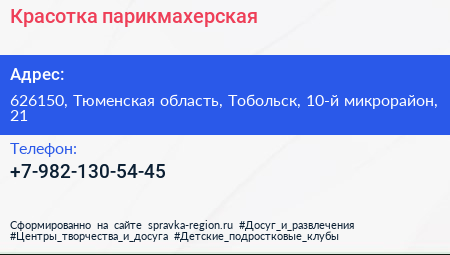 Красотка, парикмахерская по адресу 626150, Тюменская область, Тобольск, 10-й микрорайон, 21 в дальнейшем Организация, размещена в следующих категориях: