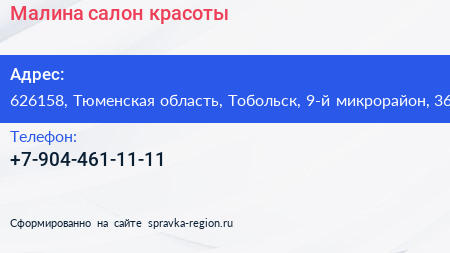 Малина, салон красоты по адресу 626158, Тюменская область, Тобольск, 9-й микрорайон, 36 в дальнейшем Организация, размещена в следующих категориях: