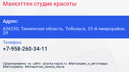 Манхэттен, студия красоты по адресу 626150, Тюменская область, Тобольск, 15-й микрорайон, 29 в дальнейшем Организация, размещена в следующих категориях: