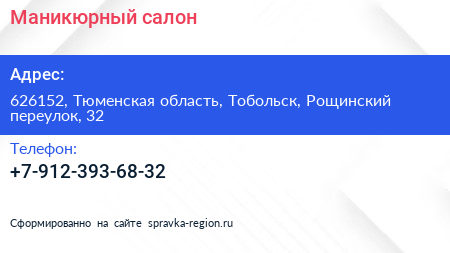 Маникюрный салон по адресу 626152, Тюменская область, Тобольск, Рощинский переулок, 32 в дальнейшем Организация, размещена в следующих категориях: