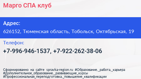 Марго, СПА-клуб по адресу 626152, Тюменская область, Тобольск, Октябрьская, 19 в дальнейшем Организация, размещена в следующих категориях: