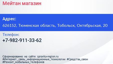 Мейтан, магазин по адресу 626152, Тюменская область, Тобольск, Октябрьская, 20 в дальнейшем Организация, размещена в следующих категориях: