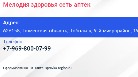 Мелодия здоровья, сеть аптек по адресу 626158, Тюменская область, Тобольск, 9-й микрорайон, 19 в дальнейшем Организация, размещена в следующих категориях:
