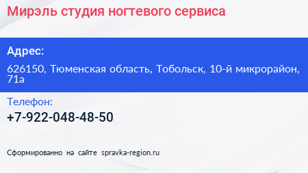 Мирэль, студия ногтевого сервиса по адресу 626150, Тюменская область, Тобольск, 10-й микрорайон, 71а в дальнейшем Организация, размещена в следующих категориях: