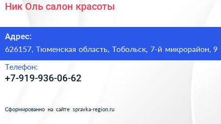Ник`Оль, салон красоты по адресу 626157, Тюменская область, Тобольск, 7-й микрорайон, 9 в дальнейшем Организация, размещена в следующих категориях: