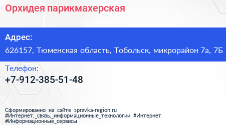 Орхидея, парикмахерская по адресу 626157, Тюменская область, Тобольск, микрорайон 7а, 7Б в дальнейшем Организация, размещена в следующих категориях: