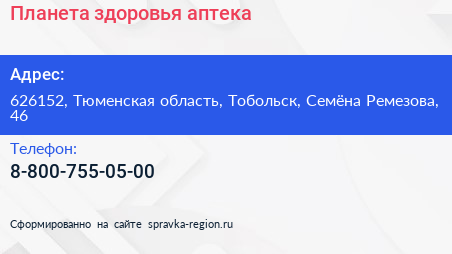 Планета здоровья, аптека по адресу 626152, Тюменская область, Тобольск, Семёна Ремезова, 46 в дальнейшем Организация, размещена в следующих категориях: