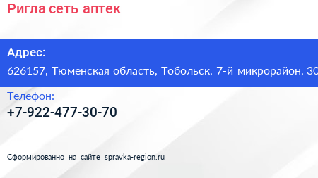 Ригла, сеть аптек по адресу 626157, Тюменская область, Тобольск, 7-й микрорайон, 30 в дальнейшем Организация, размещена в следующих категориях: