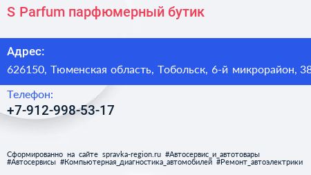 S Parfum, парфюмерный бутик по адресу 626150, Тюменская область, Тобольск, 6-й микрорайон, 38 в дальнейшем Организация, размещена в следующих категориях:
