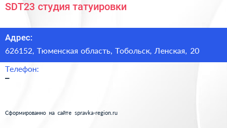 SDT23, студия татуировки по адресу 626152, Тюменская область, Тобольск, Ленская, 20 в дальнейшем Организация, размещена в следующих категориях: