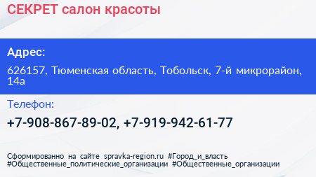 СЕКРЕТ, салон красоты по адресу 626157, Тюменская область, Тобольск, 7-й микрорайон, 14а в дальнейшем Организация, размещена в следующих категориях: