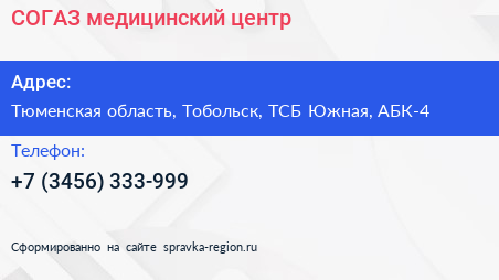 СОГАЗ, медицинский центр по адресу Тюменская область, Тобольск, ТСБ Южная, АБК-4 в дальнейшем Организация, размещена в следующих категориях: