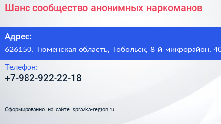 Шанс, сообщество анонимных наркоманов по адресу 626150, Тюменская область, Тобольск, 8-й микрорайон, 40 в дальнейшем Организация, размещена в следующих категориях: