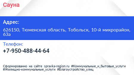 Сауна по адресу 626150, Тюменская область, Тобольск, 10-й микрорайон, 63а в дальнейшем Организация, размещена в следующих категориях: