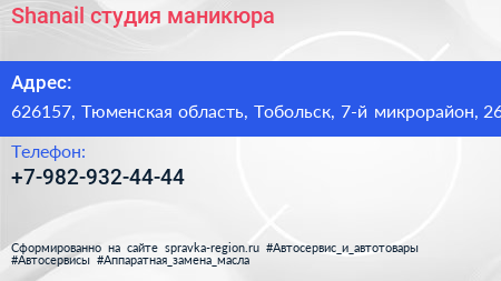 Shanail, студия маникюра по адресу 626157, Тюменская область, Тобольск, 7-й микрорайон, 26 в дальнейшем Организация, размещена в следующих категориях: