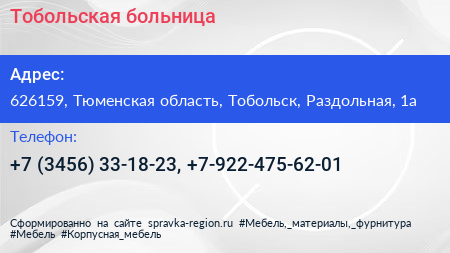 Тобольская больница по адресу 626159, Тюменская область, Тобольск, Раздольная, 1а в дальнейшем Организация, размещена в следующих категориях: