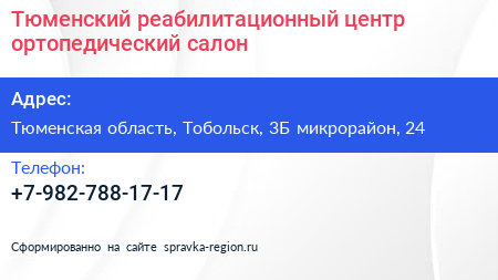 Тюменский реабилитационный центр, ортопедический салон по адресу Тюменская область, Тобольск, 3Б микрорайон, 24 в дальнейшем Организация, размещена в следующих категориях:
