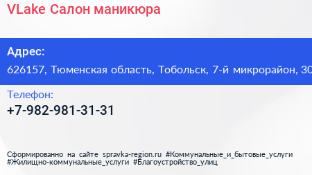 #VLake, Салон маникюра по адресу 626157, Тюменская область, Тобольск, 7-й микрорайон, 30 в дальнейшем Организация, размещена в следующих категориях: