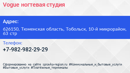 Vogue, ногтевая студия по адресу 626150, Тюменская область, Тобольск, 10-й микрорайон, 63 стр в дальнейшем Организация, размещена в следующих категориях: