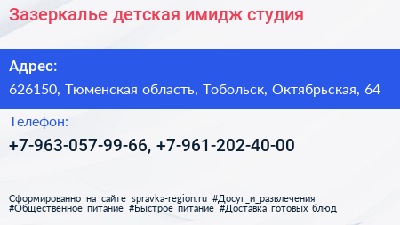 Зазеркалье, детская имидж-студия по адресу 626150, Тюменская область, Тобольск, Октябрьская, 64 в дальнейшем Организация, размещена в следующих категориях: