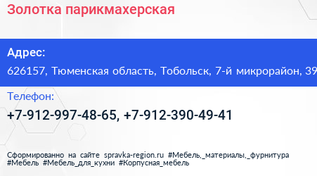 Золотка, парикмахерская по адресу 626157, Тюменская область, Тобольск, 7-й микрорайон, 39 в дальнейшем Организация, размещена в следующих категориях: