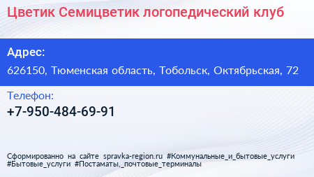 Цветик Семицветик, логопедический клуб по адресу 626150, Тюменская область, Тобольск, Октябрьская, 72 в дальнейшем Организация, размещена в следующих категориях: