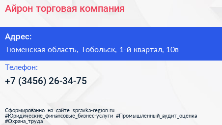 Айрон, торговая компания по адресу Тюменская область, Тобольск, 1-й квартал, 10в в дальнейшем Организация, размещена в следующих категориях: