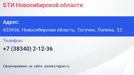 БТИ Новосибирской области по адресу 633456, Новосибирская область, Тогучин, Лапина, 13 в дальнейшем Организация, размещена в следующих категориях: