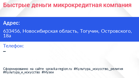 Быстрые деньги, микрокредитная компания по адресу 633456, Новосибирская область, Тогучин, Островского, 18а в дальнейшем Организация, размещена в следующих категориях: