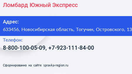 Ломбард Южный Экспресс по адресу 633456, Новосибирская область, Тогучин, Островского, 13 в дальнейшем Организация, размещена в следующих категориях: