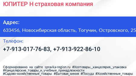 ЮПИТЕР-Н, страховая компания по адресу 633456, Новосибирская область, Тогучин, Островского, 25 в дальнейшем Организация, размещена в следующих категориях: