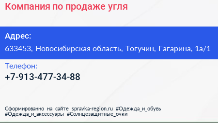 Компания по продаже угля по адресу 633453, Новосибирская область, Тогучин, Гагарина, 1а/1 в дальнейшем Организация, размещена в следующих категориях: