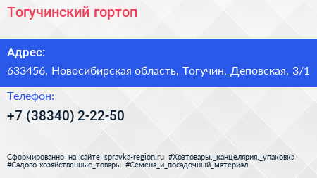 Тогучинский гортоп по адресу 633456, Новосибирская область, Тогучин, Деповская, 3/1 в дальнейшем Организация, размещена в следующих категориях: