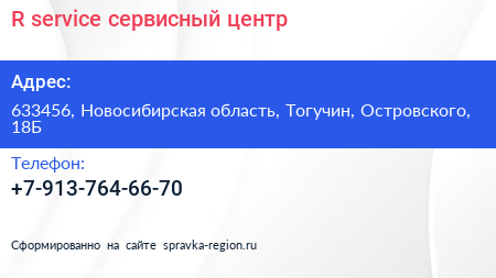 R-service, сервисный центр по адресу 633456, Новосибирская область, Тогучин, Островского, 18Б в дальнейшем Организация, размещена в следующих категориях: