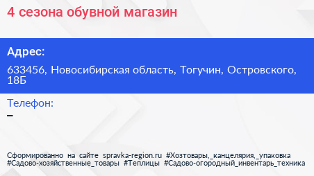 4 сезона, обувной магазин по адресу 633456, Новосибирская область, Тогучин, Островского, 18Б в дальнейшем Организация, размещена в следующих категориях: