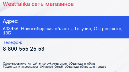 Westfalika, сеть магазинов по адресу 633456, Новосибирская область, Тогучин, Островского, 18Б в дальнейшем Организация, размещена в следующих категориях: