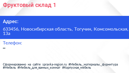 Фруктовый склад №1 по адресу 633456, Новосибирская область, Тогучин, Комсомольская, 13а в дальнейшем Организация, размещена в следующих категориях: